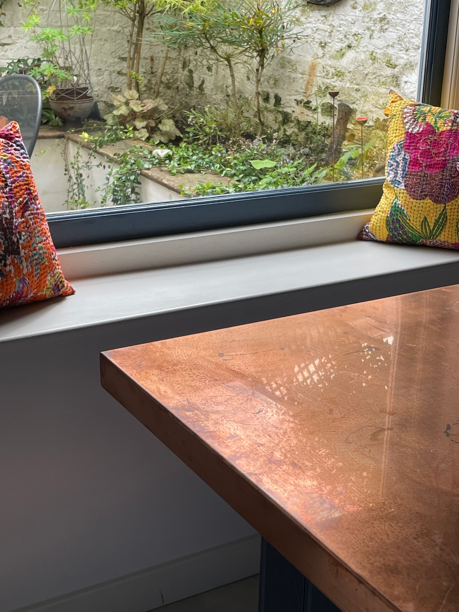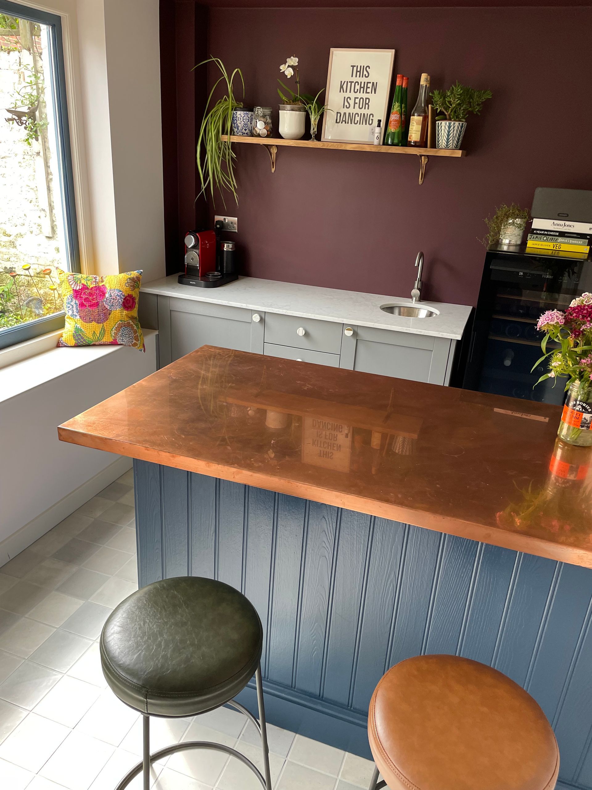 The kitchen cabinetry was installed complimented with stone and copper tops.